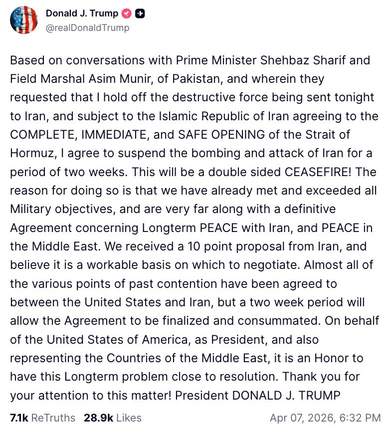 He said the US received a 10-point proposal from Iran, and says “it is a workable basis on which to negotiate,” adding that the two-week ceasefire is subject to Iran agreeing “to the COMPLETE, IMMEDIATE, and SAFE OPENING of the Strait of Hormuz.”