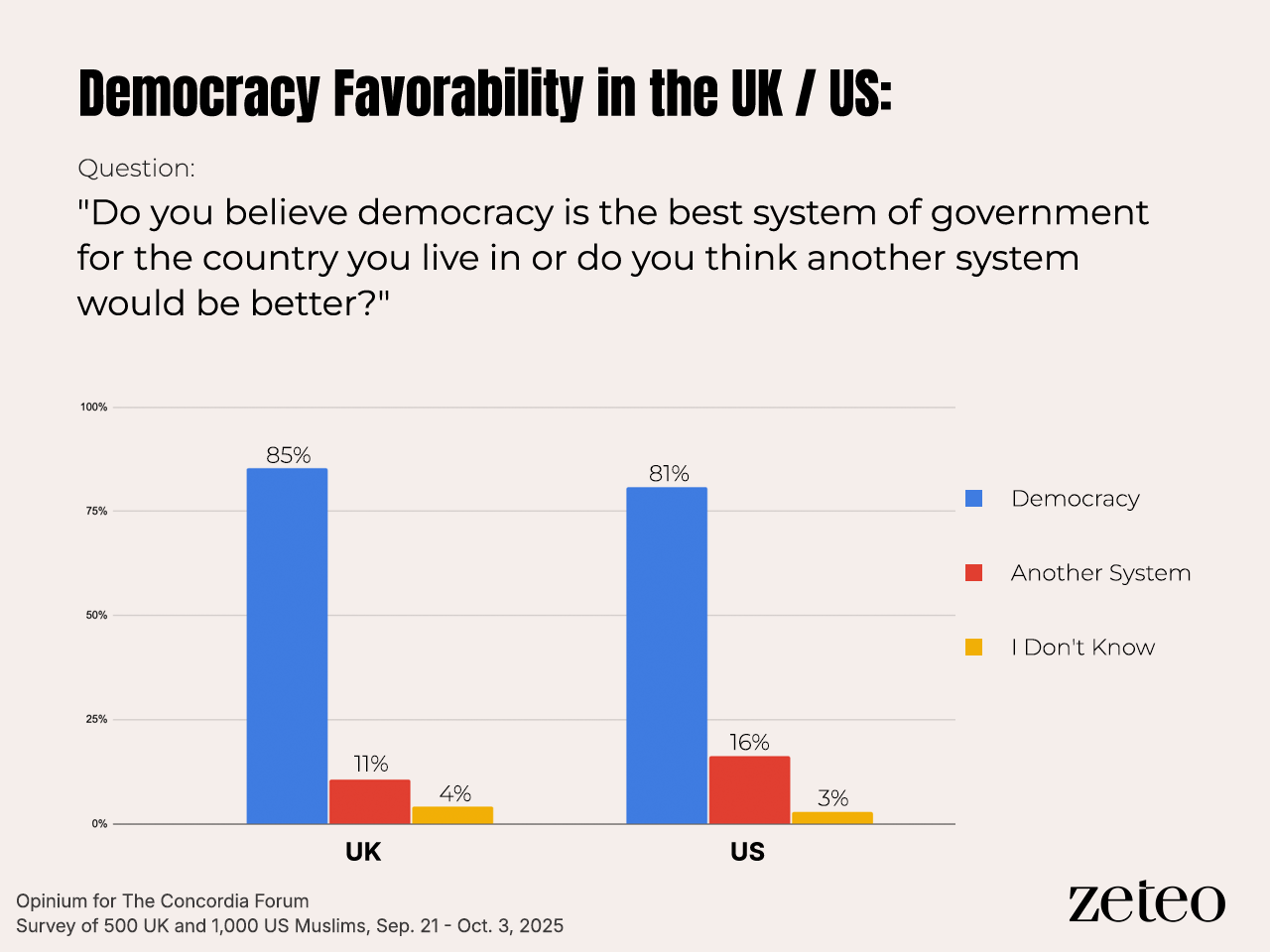 Muslims in the US and the UK overwhelmingly favor democracy and equality, but most do not believe they are always treated fairly under the law, according to a new poll shared exclusively with Zeteo.