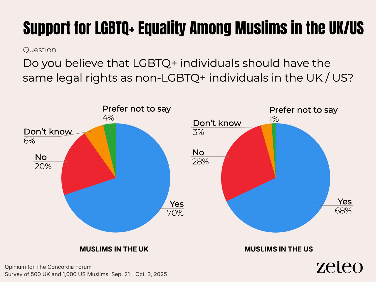 The poll also showed 70% of Muslims say LGBTQ+ people should have equal legal rights. Support is higher among older Muslims in both countries, and in the US, women are more supportive of LGBTQ+ equality than men.