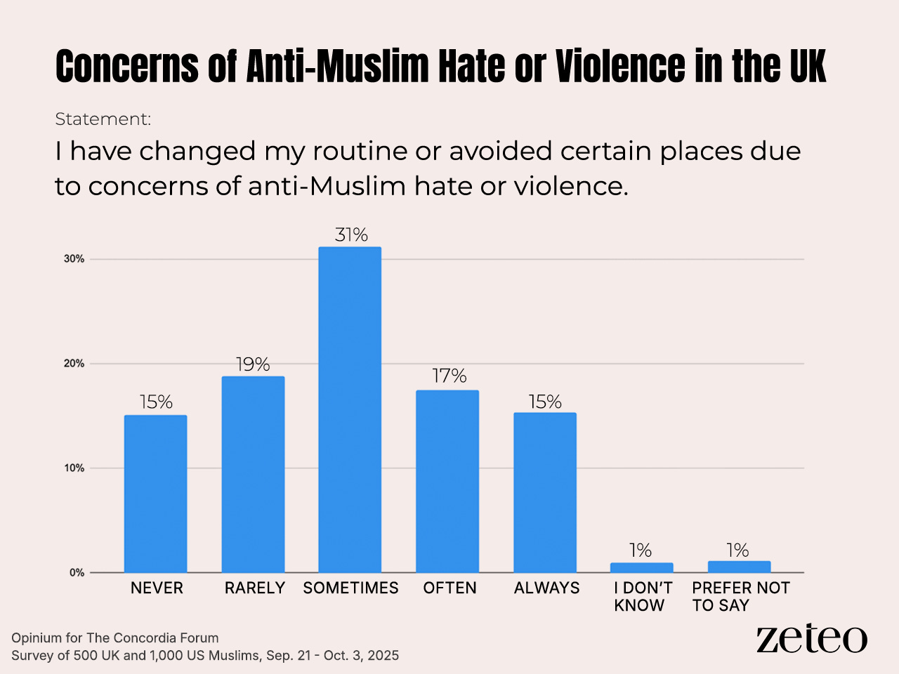 But more than half of Muslims in the UK and nearly half in the US are frequently more concerned about anti-Muslim hate or violence now than a year ago. That has impacted how people have lived their lives, with more than 39% of Muslims in the US and over 32% in the UK saying they have often or always changed their routines to avoid places due to their concerns.