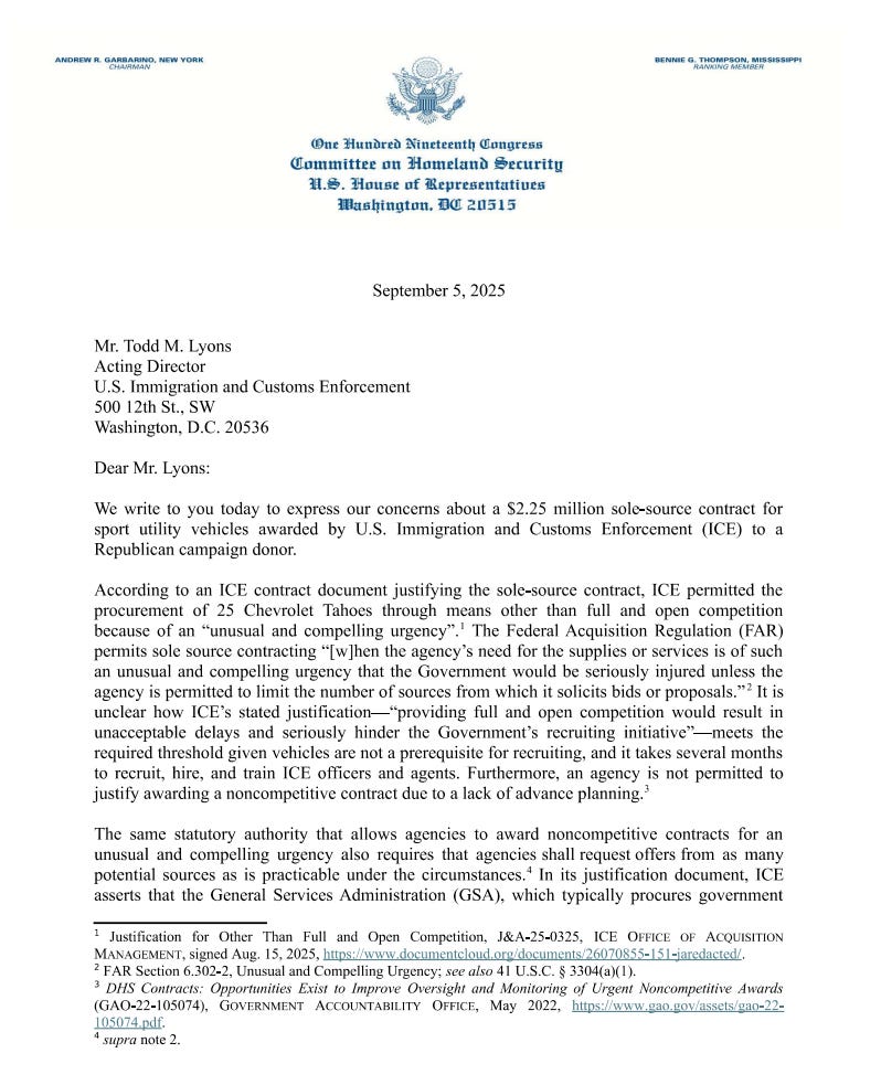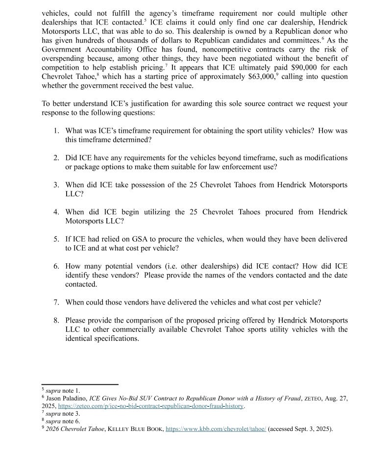 The letter, which cites Zeteo’s report, also inquires about the price per vehicle. “As the Government Accountability Office has found, noncompetitive contracts carry the risk of overspending because, among other things, they have been negotiated without the benefit of competition to help establish pricing,” the two Democrats write. “It appears that ICE ultimately paid $90,000 for each Chevrolet Tahoe, which has a starting price of approximately $63,000, calling into question whether the government received the best value.”