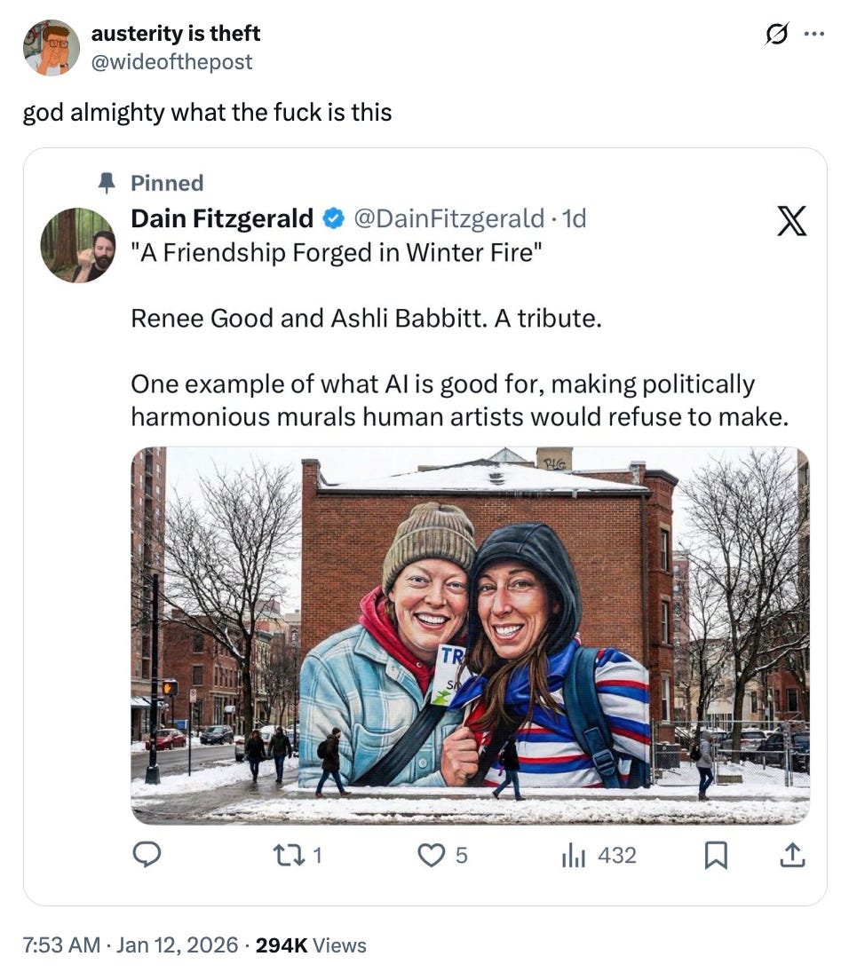 Wtf is so right on the AI mural. Renee waa a good person trying to help her neighbors out. The domestic terrorist was inviting violence and had a knife on her.