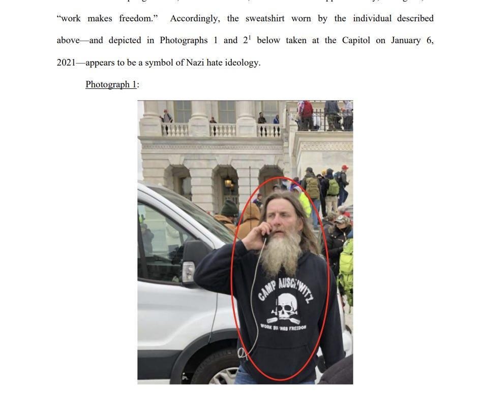 Robert Keith Packer stormed the US Capitol on Jan. 6, 2021, according to an affidavit filed in support of the criminal complaint against him. The affidavit includes photos showing Packer in a black sweatshirt emblazoned with the words “Camp Auschwitz” and “Work Brings Freedom,” the English translation of “Arbeit macht frei,” the slogan on the gate of the death camp where Nazis mass murdered one million Jews. On the back of Packer’s sweatshirt was the word “STAFF.”