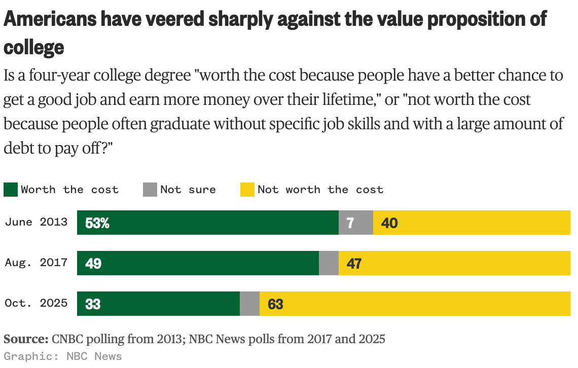 A recent NBC News poll revealed that a majority of registered voters do not believe college degrees are worth the cost. It’s almost as if Americans are tired of bearing trillions in student debt for years. Hmm, who would’ve thought?