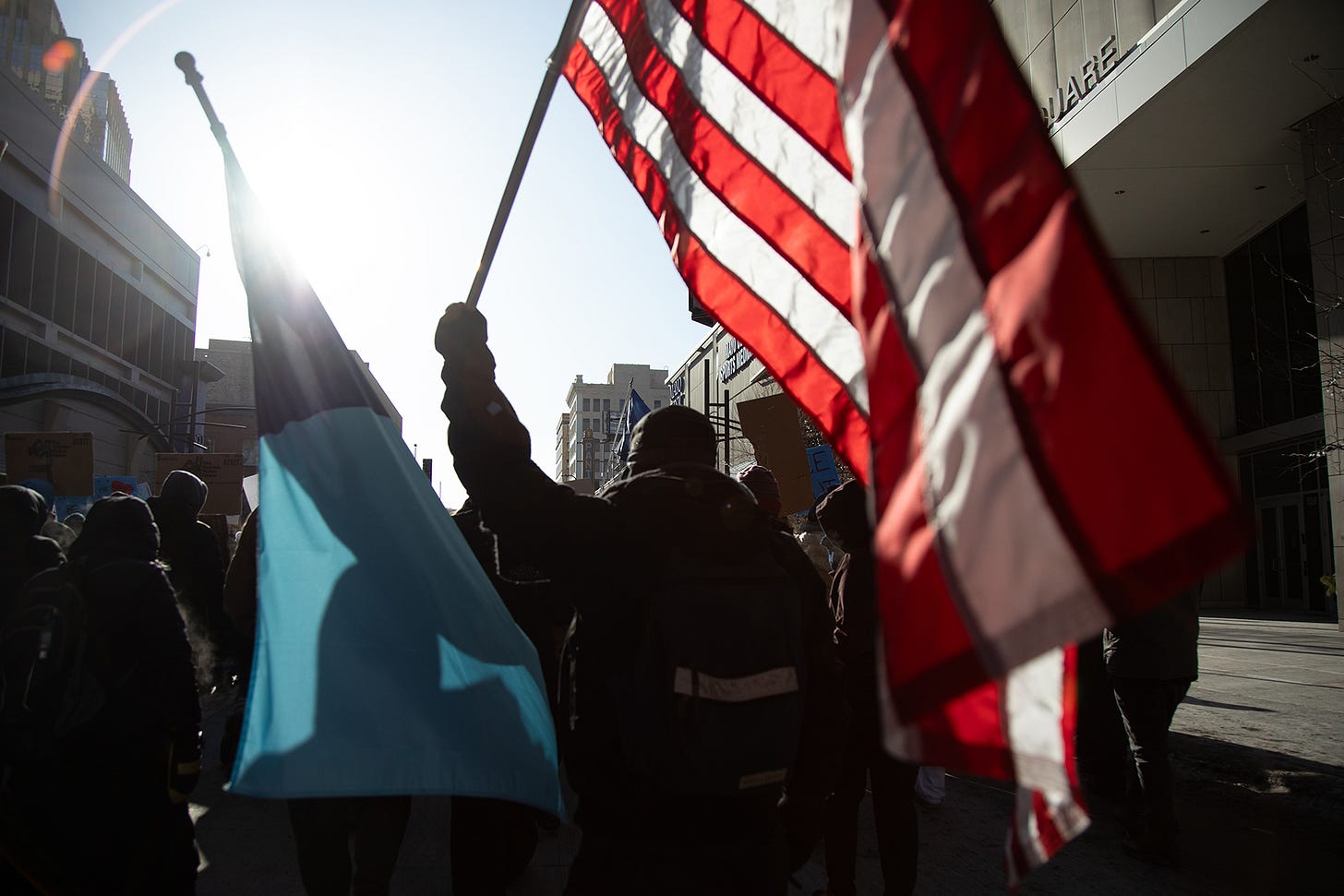 Protesters march through downtown Minneapolis to protest ICE on Jan. 25, 2025. Photo by Arthur Maiorella/Anadolu/Getty Images.