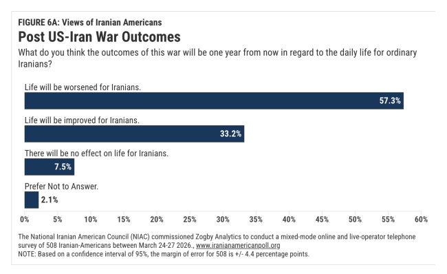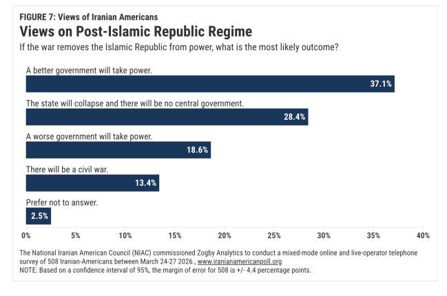A majority also believes the Islamic Republic will remain in power (53%) after the war, but if the war does achieve its initial objective of “regime change,” just 37% of Iranian Americans say it will lead to a better government taking power. 60% anticipate negative outcomes from US-led regime change, including state collapse, a worse government taking power, or civil war.