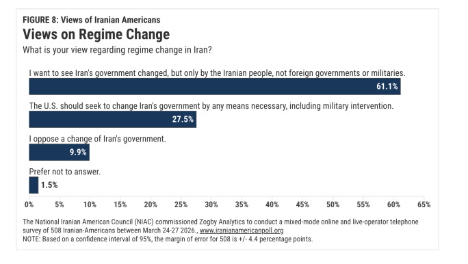 On the question of “regime change,” a majority of Iranian Americans do want to see Iran’s government changed (61.1%) – but they say only if it is changed by the Iranian people, not through foreign intervention. Just 27.5% said the US should pursue regime change through military intervention or other action.