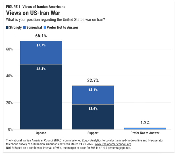 In our new polling conducted by Zogby Analytics from March 24-27, 66% of Iranian Americans say they oppose the US war on Iran, with just 33% in favor. This is a 16-percentage-point swing from the beginning of the war, when Iranian Americans were evenly split, 49%-49%, on the war.