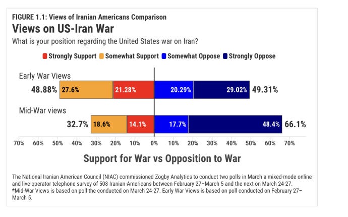 If the president or lawmakers care to hear what Iranian Americans really think about this war, and not just to use them as puppets to promote a war, the message is stark. Some 70% of Iranian Americans say the US should end the war now. Despite the significant opposition to Iran’s government, over 65% of Iranian Americans say the US should negotiate an agreement with that government to end the war. And the number one thing that Iranian Americans say the US can do to help Iranians is to end the war.