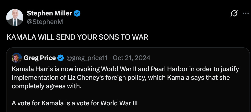He argued that Trump, unlike Harris, would “end and prevent war in the Middle East. He wants peace.”