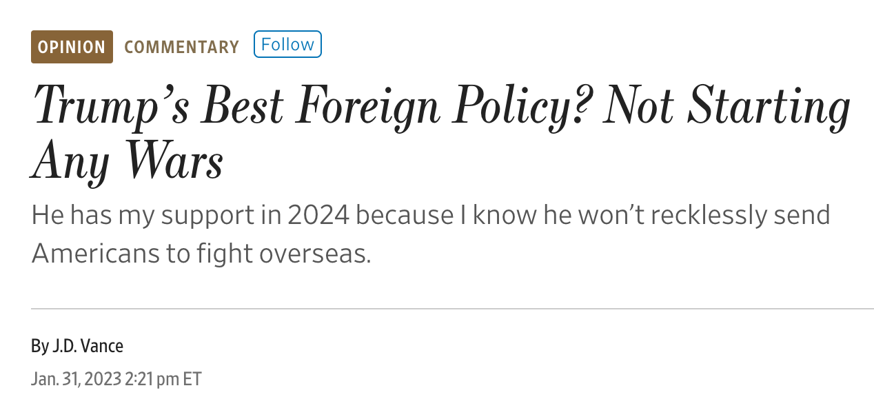 In supporting Trump’s 2024 campaign, Vance wrote Wall Street Journal column asserting that Trump “won’t recklessly send Americans to fight overseas.” Vance spoke out against the failed foreign policy consensus responsible for “starting world-historic catastrophes in the Middle East.”
