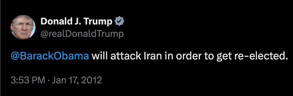 In 2012, Trump baselessly warned that Barack Obama would launch a war with Iran – to try to boost his poll numbers.
