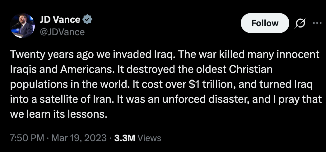 Later in 2023, Vance spoke out against the Iraq War, tweeting: “It was an unforced disaster, and I pray that we learn its lessons.”