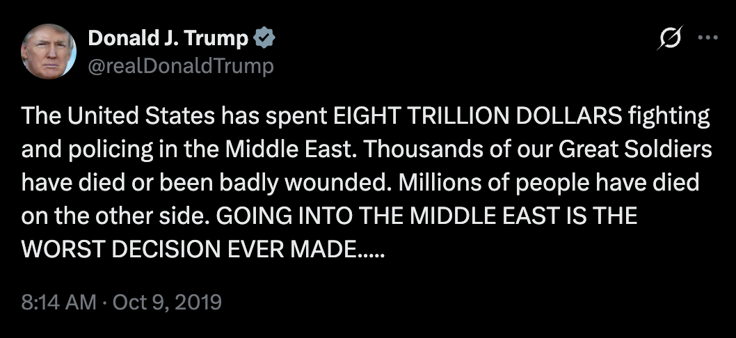 In 2019, during his first term, Trump tweeted that “GOING INTO THE MIDDLE EAST IS THE WORST DECISION EVER MADE.”