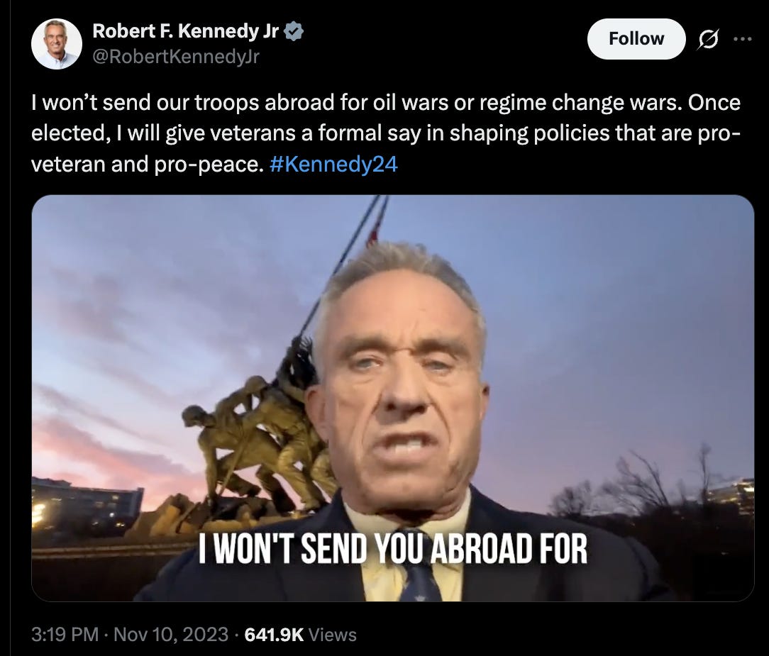During his presidential run, he released an impassioned video, filmed at an uncomfortably low angle, where he literally said, “I won’t send you abroad for regime change wars or oil wars.”