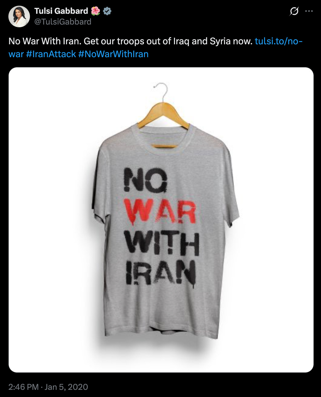 Just a few years before that, Gabbard was tweeting things like: “No War With Iran.”