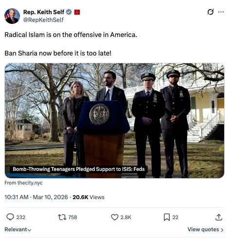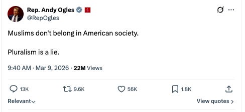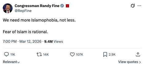 I'm embarrassed once again to see one of the reps from my state show his disgusting bigotry. Minnesota, we have got to do better than Emmer. I bet not one of the people on that list knows anything about Sharia. They should all be required to follow--and study--Qasim Rashid's Substack "Islam Today."