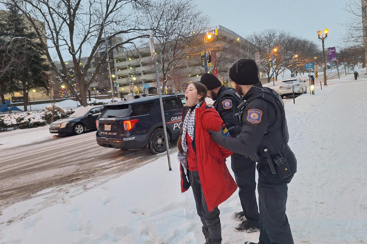 Jessica Plichta, a 22-year-old preschool teacher, spoke with Zeteo after the unusual and brazen arrest. Plichta was one of the speakers at Saturday’s protest in Grand Rapids, Michigan. She had just finished an interview with WZZM, a local ABC affiliate, when two police officers appeared behind her on camera.