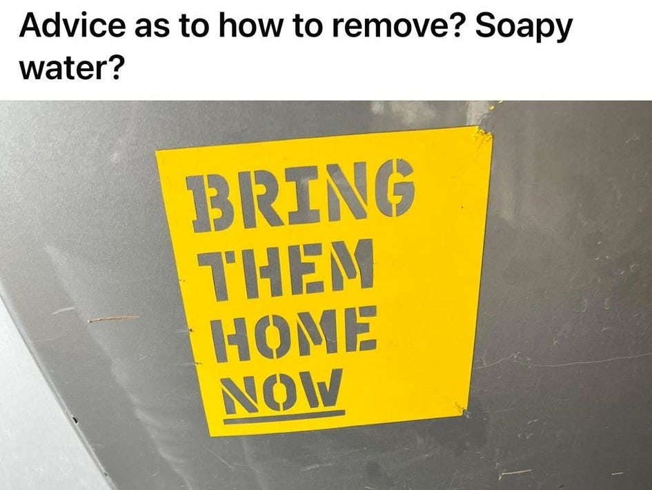 As I was scrolling through social media the other day, I came across a Facebook post showing a picture of an Israeli car with a yellow sticker reading, “Bring Them Home Now” in English. The author of the post asked a question: “Advice as to how to remove? Soapy water?” For the author, just like that – poof – their life had returned to normal: no more caring about Gaza. The person was now preoccupied with ways to remove a bright yellow sticker – crowdsourcing advice in a Facebook group.